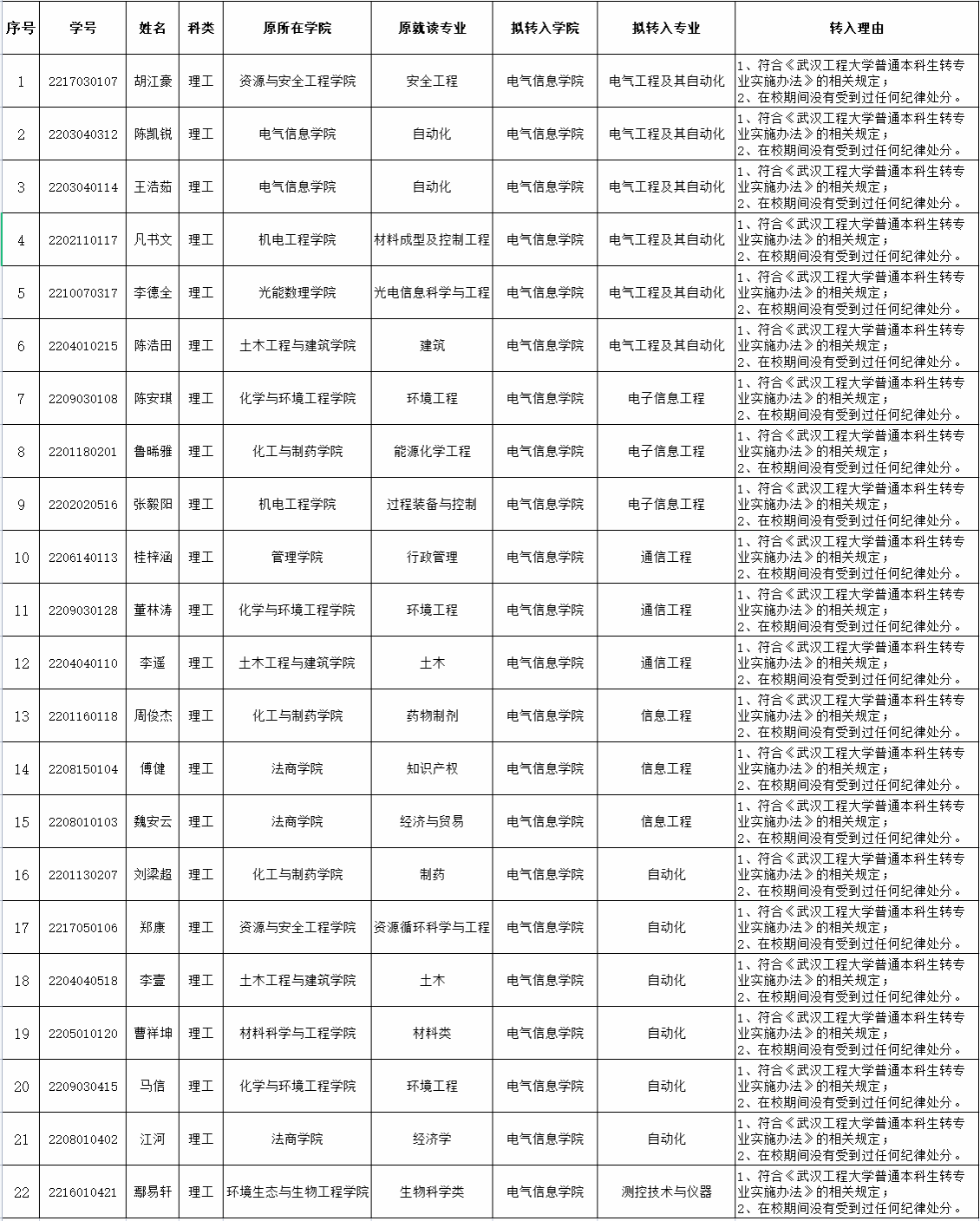 根据《武汉工程大学本科生专业调整暂行规定》文件有关规定和学校教务处《关于做好2022-2023学年第二学期普通本科生转专业工作的通知》的有关要求,拟同意胡江豪等22名学生转专业申请,现将名单予以公示(公示期为 2023年6月15日~2023年6月21日)。如对以下公示名单有异议,请于2023年6月21日12点前反映。 联系人:贺老师。