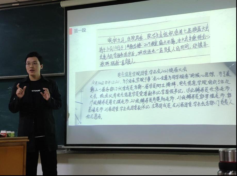 第二期课程邀请宣传部负责人2020级通信2班的杨涛同学为志愿者讲解新闻稿撰写。他将复杂难懂的新闻稿分成标题、导语、主体、结语、背景五个不同模块进行讲解。通过两位同学写作的实例来使得志愿者们对新闻稿有了更加清晰的认识,以便于更好的完成写作任务。