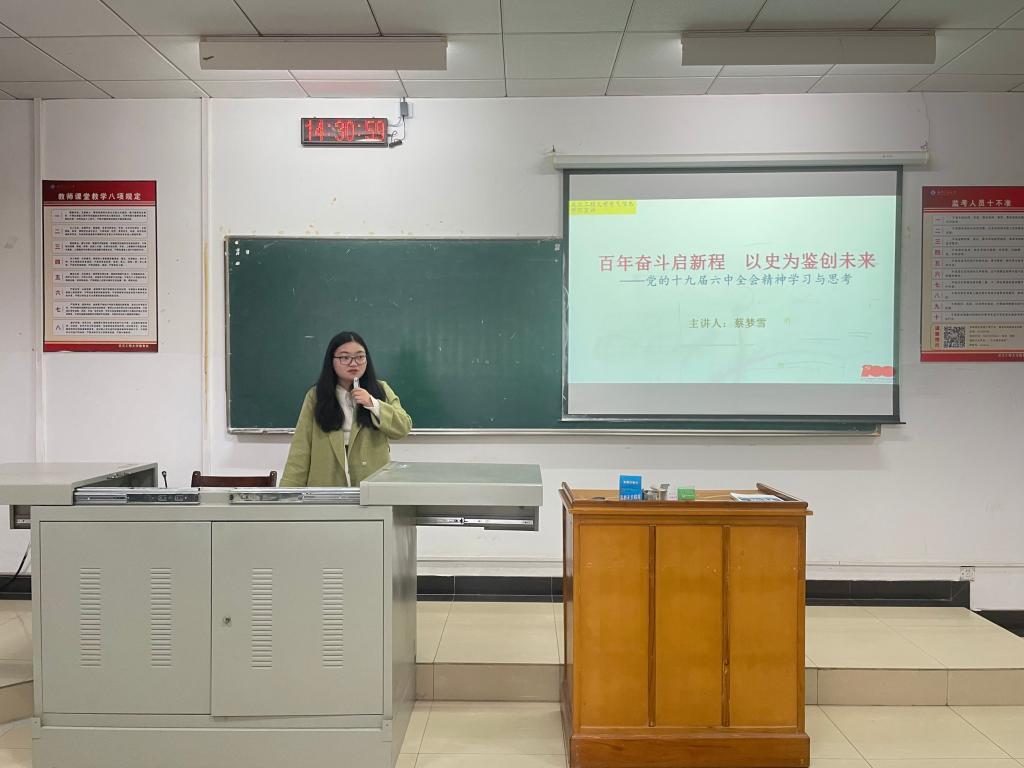 在本次活动,蔡老师分别从党的十九届六中全会主要议程、党的十九届六中全会精神概略、以百年党史为鉴开创美好未来三个方面切入主题。