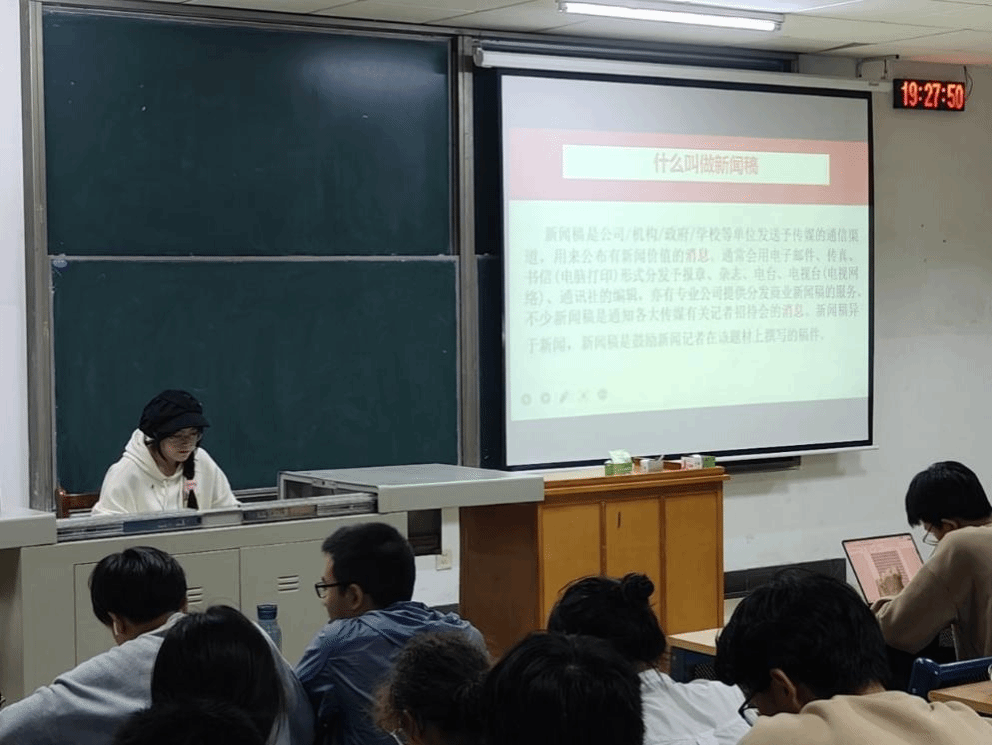 宣传部汪雨涵为志愿者讲授新闻稿撰写知识,新闻稿的结构格式,方法与技巧培训语言生动、内容通俗易懂,有效提高志愿者对新闻稿的认知,提升撰写水平,使志愿者进行新闻稿撰写时更加得心应手
