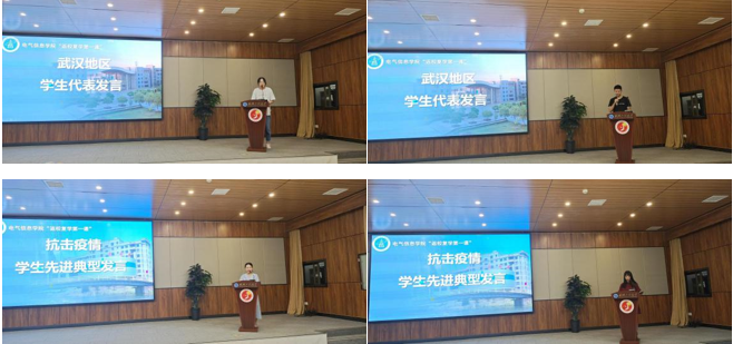 武汉地区的学院学生代表赵雅洁、黄嘉睿,分享了自己疫情期间亲身经历,抗疫先进典型杨颖、马姝玮,介绍自己疫情期间参与的志愿服务活动。 2017级赵雅洁同学讲述了自己和姐姐在家中“留守”近半年的生活点滴故事,“那些每天靠着白菜、萝卜、蜗居度过的日子;那些被不断增长的感染人数震惊的日子;那些“禁足”在家拍着夕阳度过的日子……都历历在目,恍如昨日,如今想起,仍会感到辛酸无比。” 2019级黄嘉瑞同学与大家分享了“隔离”的亲身经历,“因接触过的一个邻居确诊,我和家人在酒店经历了14天难忘的隔离时光。那14天,每天都会测量两次体温,三天一次核酸检测。酒店里的阿姨会只敲一下门就放下饭离开,这是我们的心照不宣。护士阿姨也会在深夜写长文感谢我们对她们工作的理解,我怕打扰她们休息,只能回复一句你们也要注意安全,然后互道晚安入睡。”两位同学身处疫情震中——武汉的生活经历,让在座师生感同身受也感动不已。