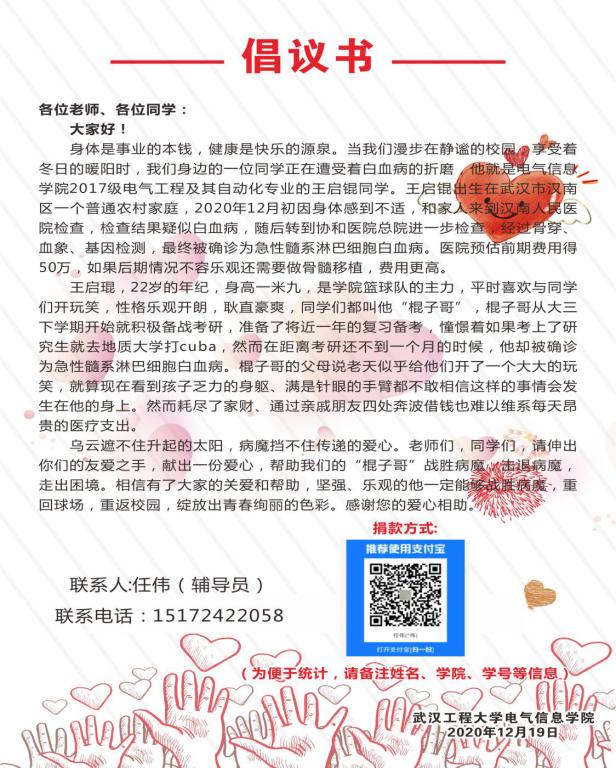 王启锟为best365网页版登录2017级电气工程及其自动化专业学生,2020年12月初因身体感到不适,和家人来到汉南人民医院检查,检查结果疑似白血病,随后转到协和医院总院进一步检查,经过骨穿、血象、基因检测,最终被确诊为急性髓系淋巴细胞白血病。