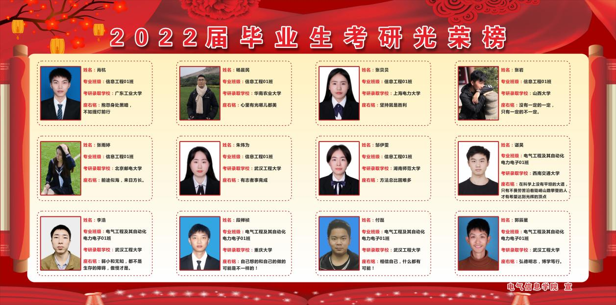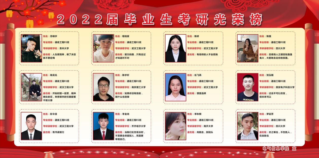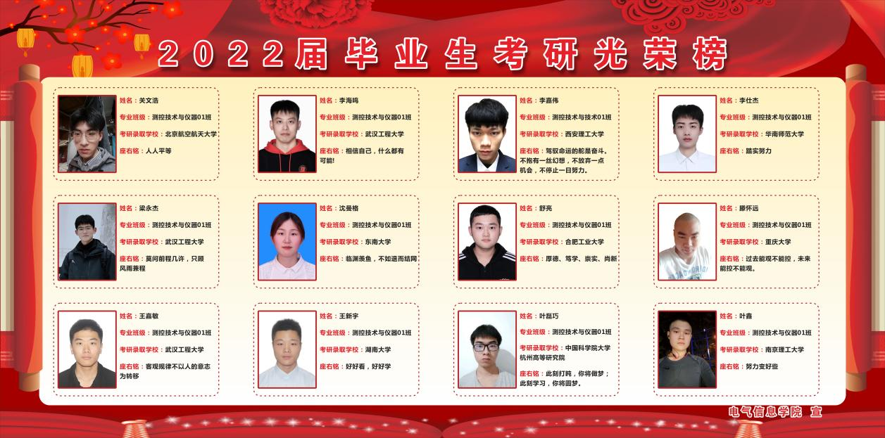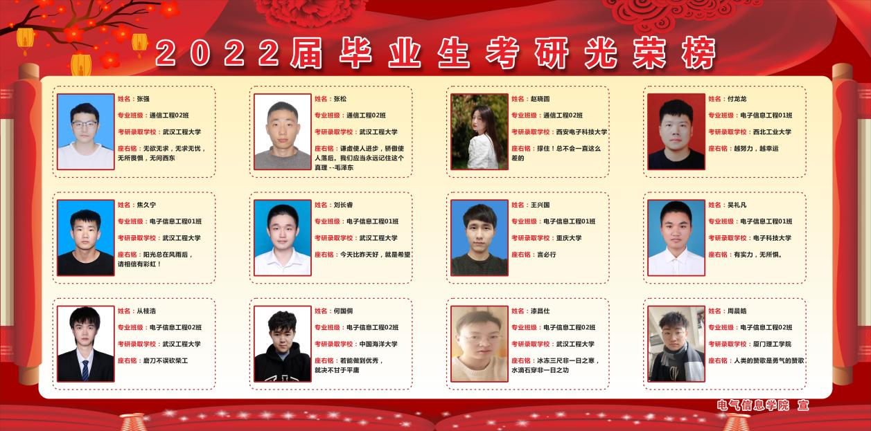 本网讯(通讯员 任伟)辛勤耕耘有矢志,硕果飘香又一年。随着2022年全国硕士研究生招生录取工作结束,我院考研学子喜讯频传。141人考取研究生,录取率35.25%,创学院历史新高。录取院校包括南开大学、重庆大学、中国海洋大学、西北工业大学、四川大学、华南理工大学、湖南大学、东南大学、东北大学、电子科技大学、北京航空航天大学、中国矿业大学、西安电子科技大学等双一流名校,另有1名同学被美国圣路易斯华盛顿大学录取。这些优异成绩的取得,既是考研学子奋勇拼搏、勤学苦干的结果,更是学院常抓教风学风建设、注重提升教育教学质量的体现。