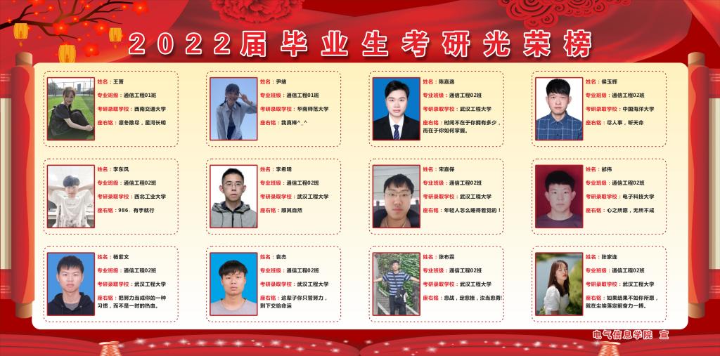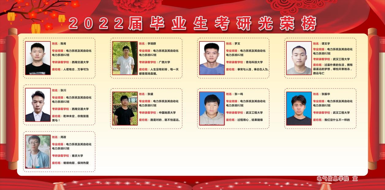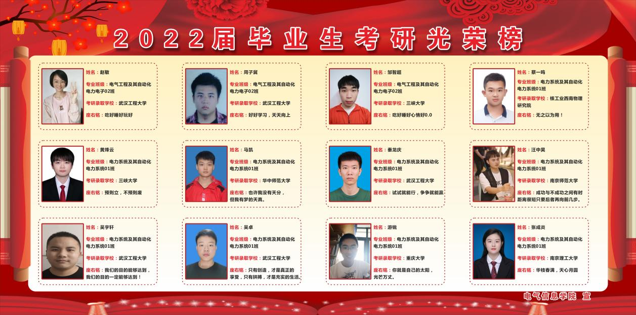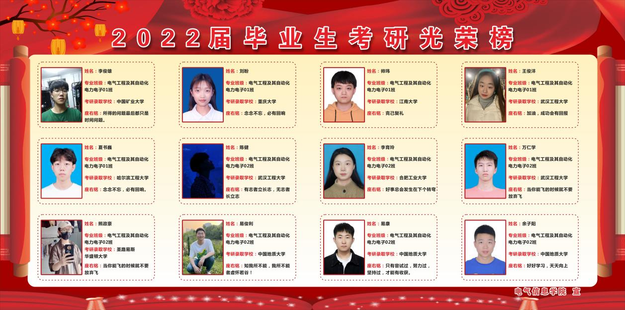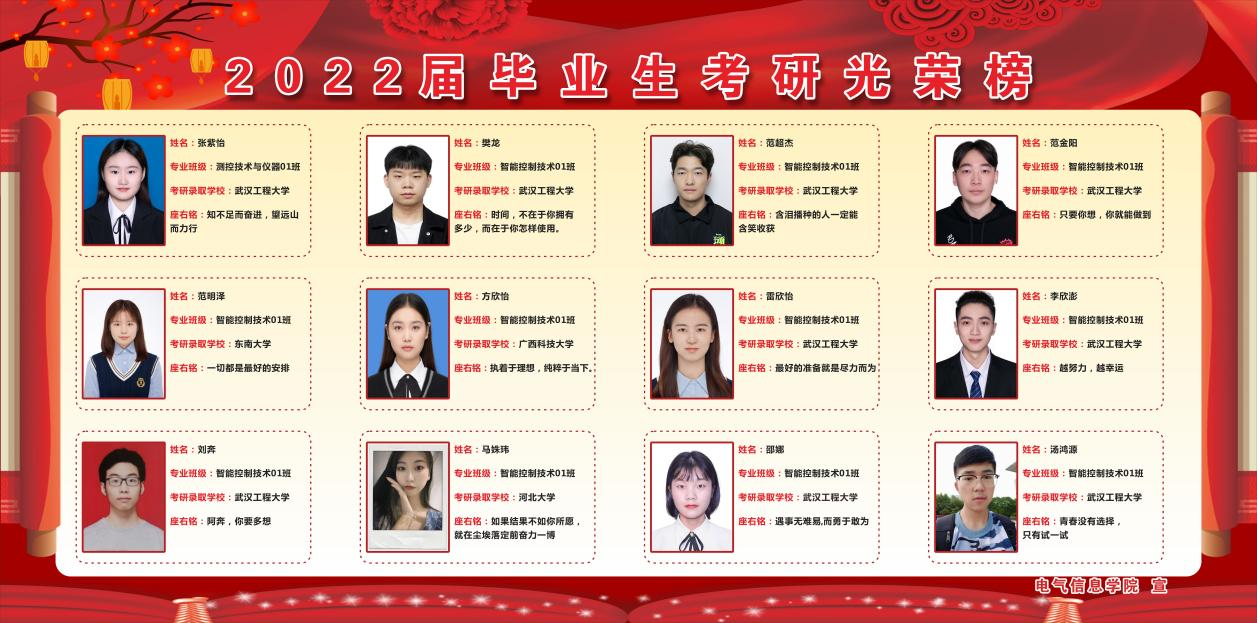 本网讯(通讯员 任伟)辛勤耕耘有矢志,硕果飘香又一年。随着2022年全国硕士研究生招生录取工作结束,我院考研学子喜讯频传。141人考取研究生,录取率35.25%,创学院历史新高。录取院校包括南开大学、重庆大学、中国海洋大学、西北工业大学、四川大学、华南理工大学、湖南大学、东南大学、东北大学、电子科技大学、北京航空航天大学、中国矿业大学、西安电子科技大学等双一流名校,另有1名同学被美国圣路易斯华盛顿大学录取。这些优异成绩的取得,既是考研学子奋勇拼搏、勤学苦干的结果,更是学院常抓教风学风建设、注重提升教育教学质量的体现。