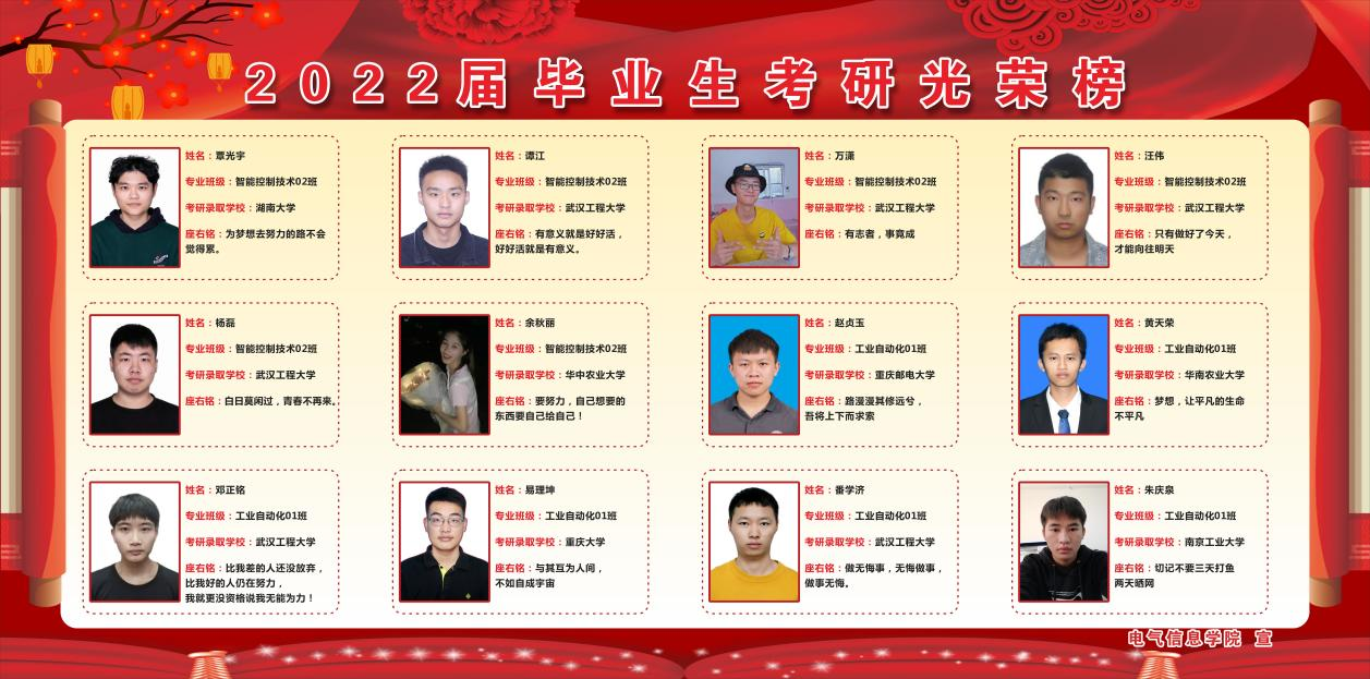 在被录取的141名同学中,8名同学考研初试成绩在400分以上,77人被国内外双一流高校录取。本届考研中,涌现出一批优秀的考研班级、考研宿舍、高分考生。其中,“学霸班级”信息工程1班,考研录取率达到61.29%;“学霸宿舍”TS9-649,四位“学霸”刘栋梁、黄天荣、李海鸣、柯霄汉分别被安徽大学、华南农业大学、武汉工程大学、华东理工大学录取;“考研状元”智能控制技术方向1班王子溢以学院最高分411分被重庆大学录取。