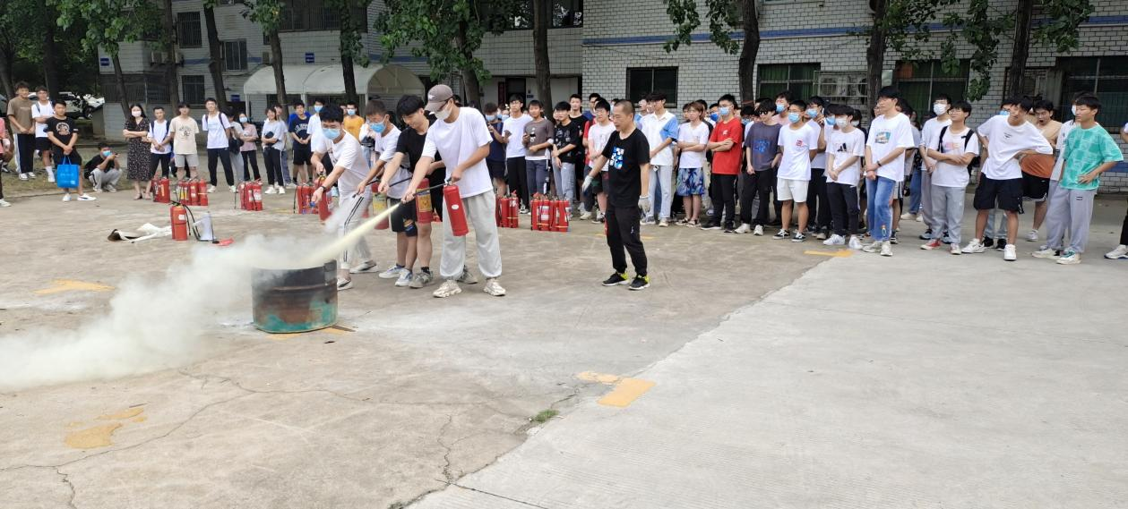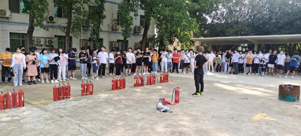 校保卫处王子龙老师结合全国高校发生的火灾典型案例,强调了消防安全培训的重要意义和必要性。告诫同学们不使用大功率电器、不乱接电线,不在宿舍存放易燃易爆物品,外出要确保电器断电。随后现场示范了灭火器的使用及扑救火灾的方法。“提、拉、握、压”,对现场同学进行一对一指导。同学们在保卫处老师的指导下依次使用灭火器,扑灭明火。
