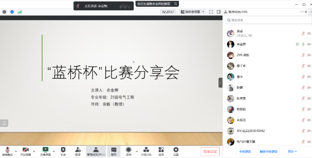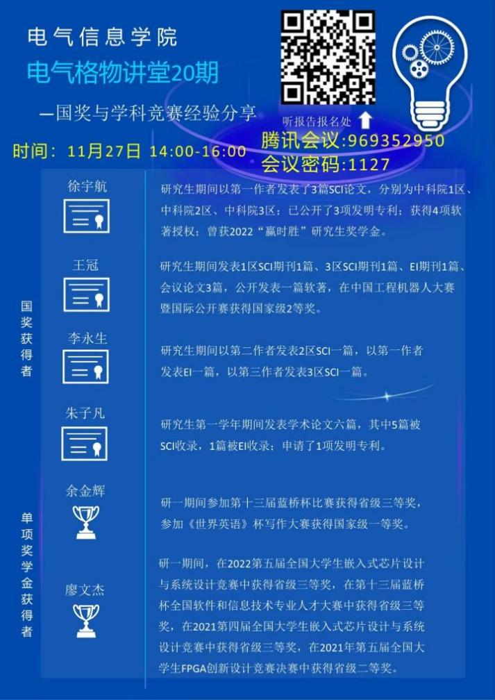 本网讯(通讯员 黄光亮 吴卓)为加强学院科研竞赛交流,正向引导学术科研,营造良好学风氛围,11月27日下午,best365网页版登录开展了科学道德与学风建设活动(电气格物讲堂第20期)。四位研究生国奖获得者两位单项奖学金获得者进行学术和竞赛经验分享110多名研究生和本科生线上参加了此次活动。