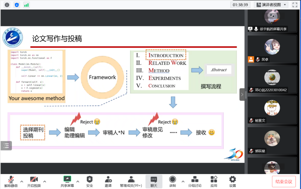 2021级国奖获得者李永生结合自身的科研项目经历讲述了发表科研成果的流程。他指出第一粒扣子一定要扣好,首先要和导师确定好研究方向,广泛查阅相关文献,了解相关前沿技术,从中找到研究点和创新点,研究过程应从易到难、循序渐进、独立思考,研究过程应该积极与老师、学长学姐交流。