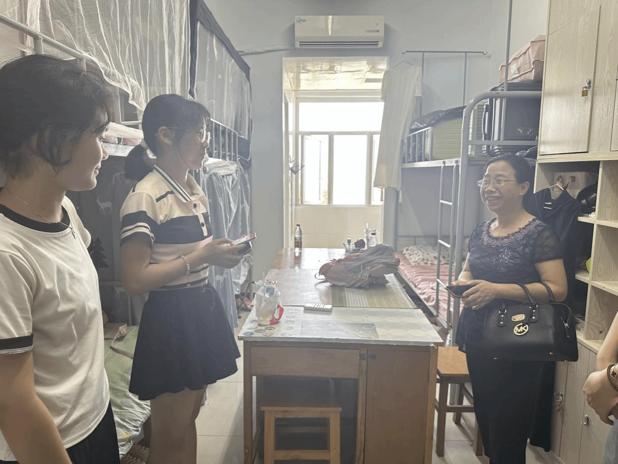 9月10日下午,班主任深入新生宿舍,与同学亲切交谈。老师们仔细询问了新生的各项情况,认真查看宿舍的各项设施是否完备,深挚言语间展现着学院对新生们的关怀与期盼。新生们也都纷纷表示,将尽快适应大学生活,以最佳状态投入军训,并在接下来四年的大学生涯中努力学习专业知识,发展自我,不负学院的期盼。