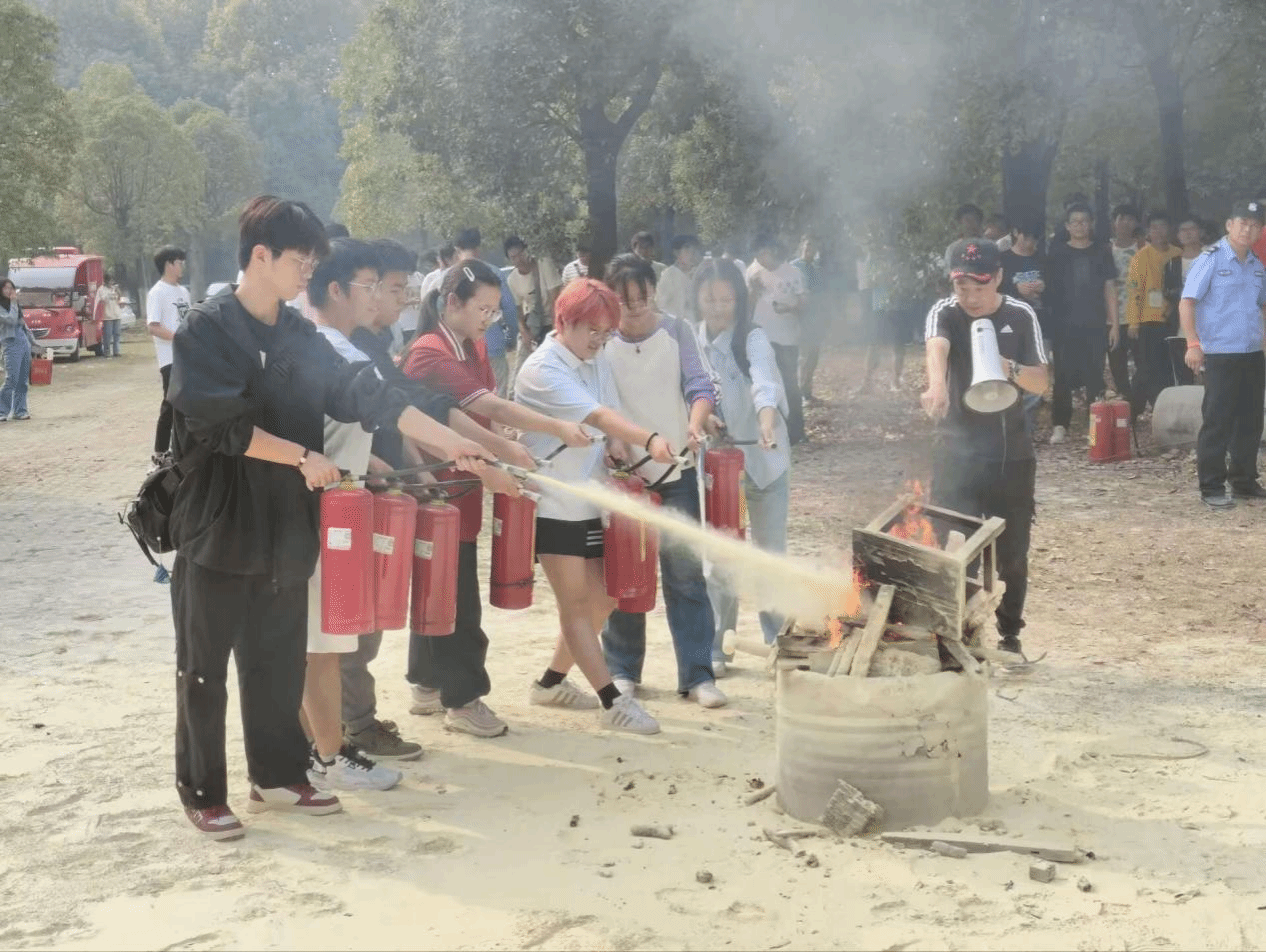 随后,王老师向学生介绍常用灭火器的使用原理以及操作要领,指出在使用的时候务必注意“一提、二拔、三对准、四按压”,对准火源,以达到灭火效果。在保卫处工作人员的指导下,同学们兴致高涨,主动上前轮流动手尝试使用灭火器,通过亲身体会进一步掌握灭火器的使用技巧。
