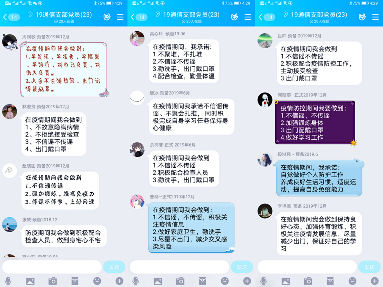最后,支部全体党员通过线上QQ群接力形式开展“防控疫情,从我做起”承诺活动,带头践行疫情防控相关要求,主动发挥党员先锋模范作用。