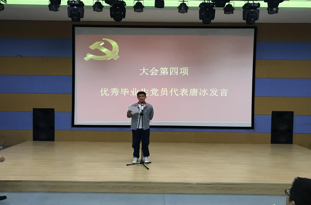 推免到华中科技大学读研的优秀毕业生党员代表唐冰结合大学四年的成长经历以及学习收获表达了对学院以及学校的感恩之情,并表示不管走到哪里,都会牢记党员身份,不忘初心,砥砺前行。