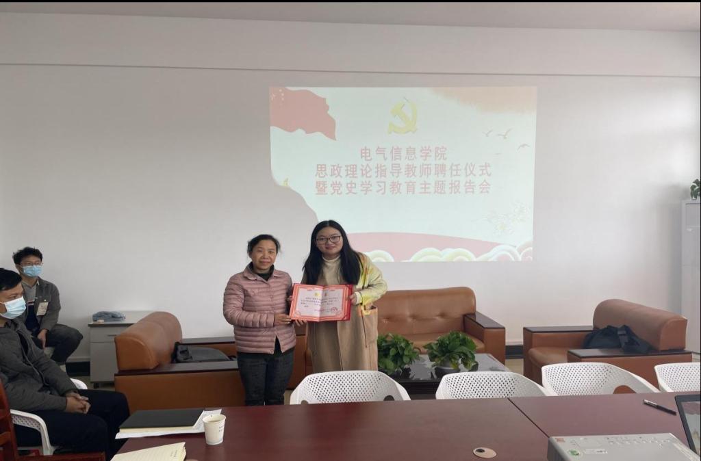 会上,学院党委书记谢春晖为马克思主义学院蔡梦雪老师颁发思政导师聘书。谢春晖对思政导师结对帮扶指导学院开展课程思政建设、联合开展大学生思想政治教育理论实践研究工作表示充分肯定,对蔡老师的到来表示热烈欢迎。她要求学工办全体辅导员加强与蔡老师的沟通联系,学习理论知识,更好的指导实践工作,增强开展大学生思想政治教育工作的实效性;要求全体学生上好思政课,将党史学习教育与思政课教育紧密结合起来,将提升专业技能与服务社会发展结合起来,通过思政课学习启迪智慧,丰富经历,增长才干。