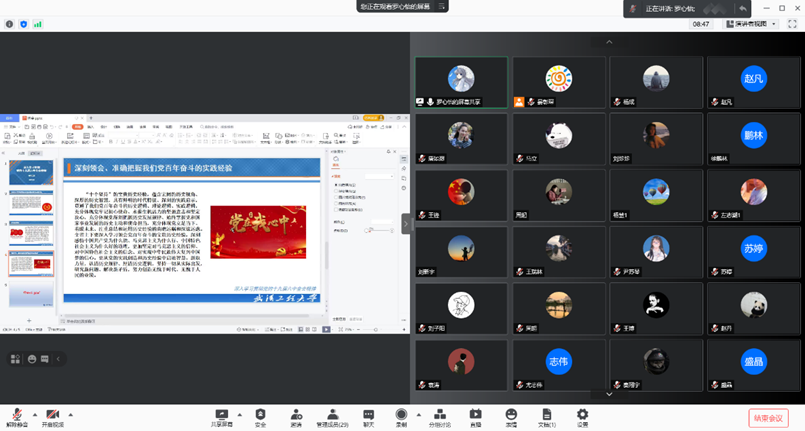 2019级研究生三个班联合召开线上主题班会,通过线上视频会议的形式学习十九届六中全会精神,通过主题学习内容宣读,网站学习,深刻认识了“两个确立”的重大意义,激励我们锚定既定奋斗目标,意气风发走向未来