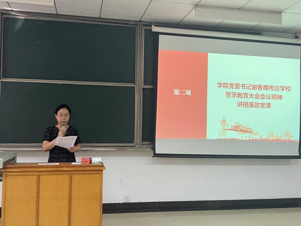 学院党委书记谢春晖首先传达了学校警示教育大会会议精神并结合学院实际工作讲授廉政党课。她提出召开本次警示教育大会是深入贯彻落实习近平总书记关于全面从严治党重要论述,认真落实党中央决策部署和省第十二次党代会精神,教育全体教职工以案为鉴、警钟长鸣,推进清廉学院建设,着力营造风清气正、干事创业良好政治生态,为学院重点工作保驾护航。她强调一是要把党的政治建设摆在首位,坚定政治方向,加强政治监督,强化政治责任;二是要强化责任担当,领导干部要切实履行好“一岗双责”,将党风廉政建设责任制贯彻到工作的各个环节;三是要加强作风建设,纠正“四风”树新风,营造担当作为、干事创业的浓厚氛围;四是要强化纪律和规矩意识,自觉形成遵纪守纪的高度自觉和良好习惯;五是要加强师德师风建设,以德立身、以德治学、以德施教,争做“四有”好老师;六是要加强干部队伍建设,站在学院事业发展全局的高度带头守纪律,带好队伍管好人,以勇争上游的精神状态主动投入到学院专业工程认证、博士点申报等学院事业发展重点工作中。
