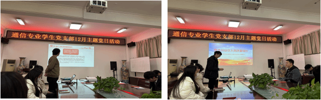 本网讯(通讯员 周雯琪)12月27日下午,通信专业学生党支部全体党员、入党积极分子代表在学院319会议室组织开展12月主题党日活动,本次会议由支部书记周雯琪主持。