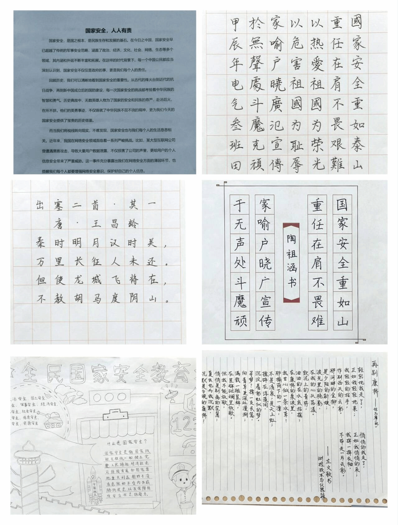 为了增强国家安全教育宣传的针对性、实效性,营造学习国家安全知识的浓厚氛围,4月初学院开展了国家安全日专题书画作品征集比赛,用艺术传递爱国情怀。活动一经启动便引发了各专业学生的热烈响应。他们纷纷以独特的艺术作品,表达对国家安全的深刻理解和坚定信念。书法的每一笔、每一划都凝聚着参赛者对国家未来的美好憧憬和无限期望;有的征文作品则以细腻的笔触,书写着对国家安全的深刻理解和感悟,主题鲜明,内容丰富,既有对国家安全战略的深入解读,也有对日常生活中维护国家安全的点滴体会。每一份作品不仅充分展示了同学们的艺术才华和创作能力,更展现了他们对国家安全蓝图的美好愿景,为本次国家安全教育系列活动增添了浓墨重彩的一笔。