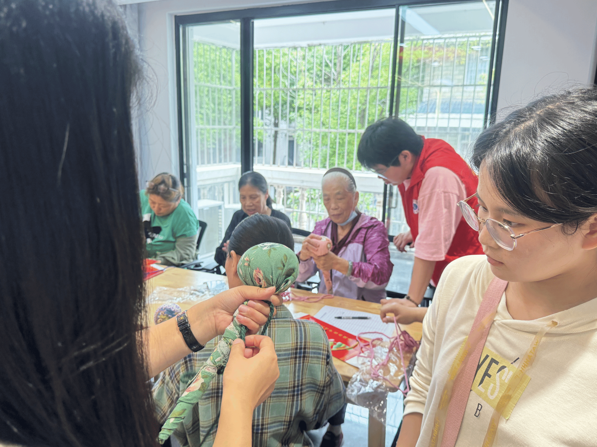 活动现场志愿者们细心分发粗布、艾草包、手柄等手工材料,社工张老师一边讲解艾草锤的功效和作用,一边为大家演示如何制作,“打开艾草包,铺平布料,先将晒干的艾草用内布料包裹住,捏成一个紧实的圆形,捆绑皮筋,随后把支撑棍插入包好的艾草包......”。志愿者们耐心地解释每一个步骤,一对一帮助不会操作的老年人,这不仅是一次技能传授,更是一次心与心的交流。