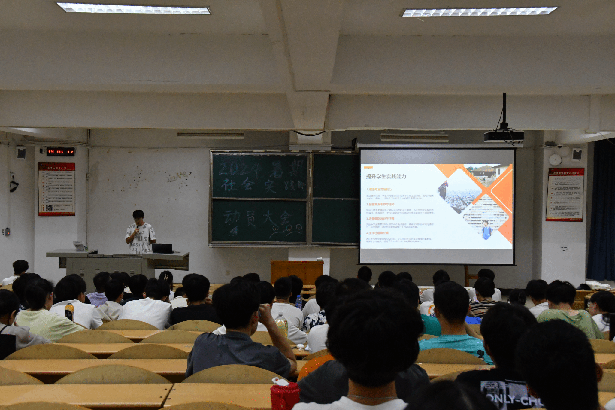 动员大会上邀请了两名2022级同学向大家分享寒假期间社会实践的宝贵经验。张如涛同学讲述了其在云南梁河县两段志愿经历,谈到在葫芦丝比赛中担任志愿者,他与团队成员辅导小朋友们学习生活,深切感受到实践带来的无穷乐趣,同时自身综合能力也得以显著提升;另一个则是走进“云岭小学堂”,针对当地二十余名小、初中生开展支教活动,张如涛学长着重强调了课程的丰富性与针对性,不仅涵盖知识层面的答疑辅导,还包括绘画、体育等丰富多彩的内容。