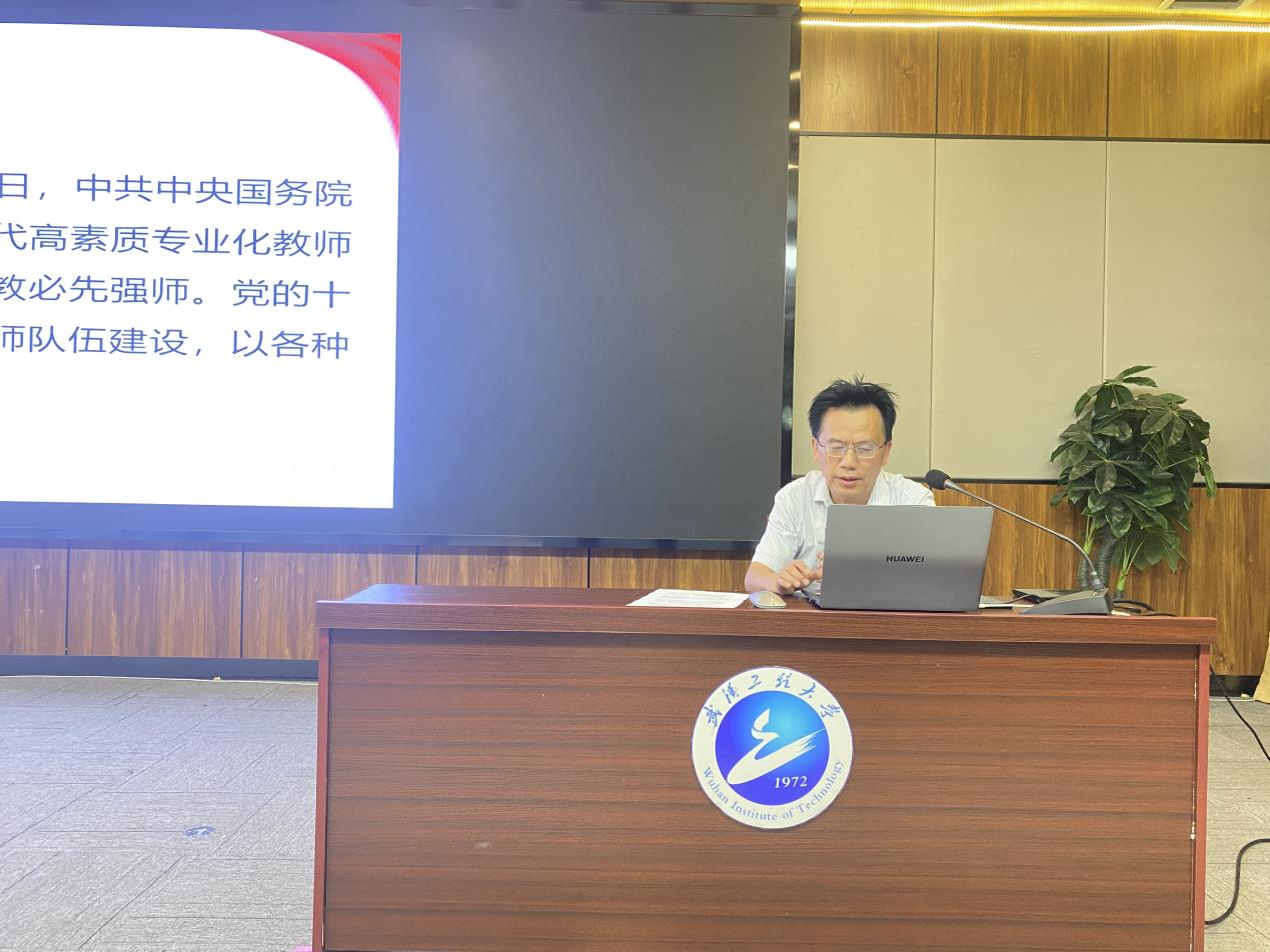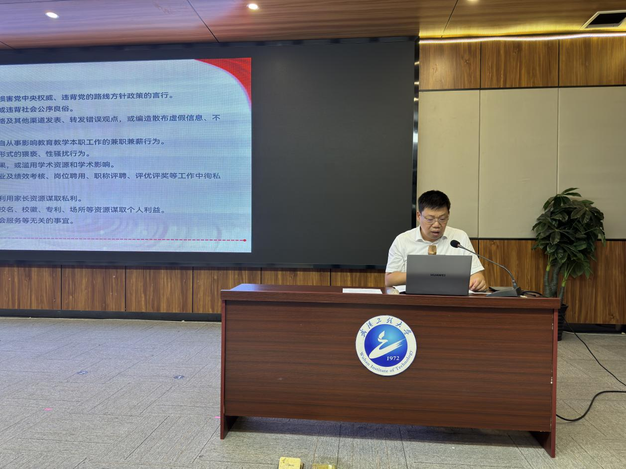 学院副院长田斌领学《武汉工程大学师德师风负面清单及师德失范行为处理办法》。他强调,全体教师要自查自省、规范职业行为、把师德底线牢记于心,增强教师的责任感、使命感、荣誉感,自觉追求高尚,以德立身、以德立学、以德施教、以德育德。
