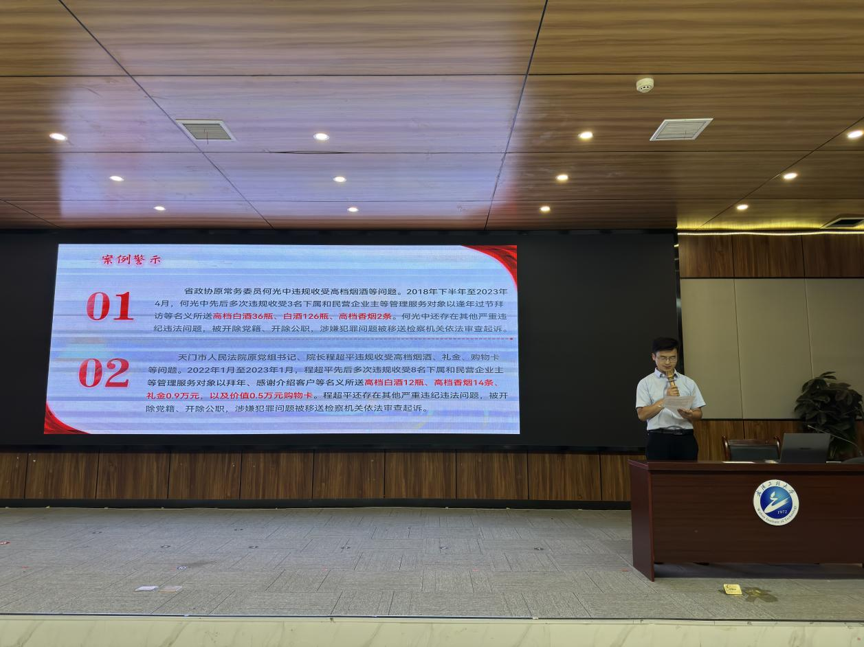 学院党委副书记周磊通报了《省纪委监委通报6起违规收受高档烟酒问题典型案例》。他强调,全院教职工要以案为鉴,充分认识“风腐一体”的演变规律,坚决纠正“收受烟酒小节论”等错误思想和模糊认识,切实强化纪法意识、规矩意识,把落实中央八项规定精神刻印于心。
