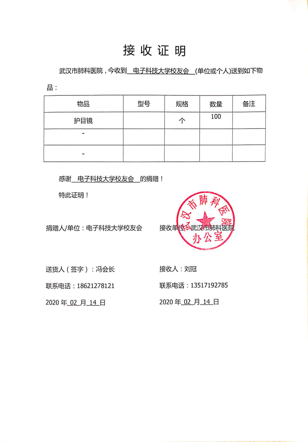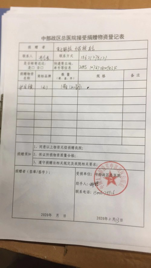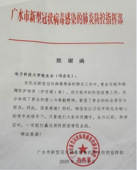 同时,冯老师还是电子科技大学湖北校友会负责人,疫情发生后,他号召电子科技大学全球校友,调动一切力量与资源,第一时间自发行动,捐赠急需物资,协调解决医院物资的调配和运输,再接再厉、继续行动,共同确保打赢这场抗击新冠肺炎的决战。期间,他组织落实电子科技大学校友企业深圳市世强先进科技有限公司总裁肖庆同志向武汉协和医院捐赠100台呼吸机、50台制氧机;电子科技大学81级校友惠州亿纬锂能股份有限公司董事长兼总裁刘金成同志向湖北省荆门市高新区及相关医院捐赠50万元、一批N95口罩及12万只医用口罩,亿纬锂能公司为武汉市火神山医院5G基站的调测及正常开通提供电力保障等支援;电子科技大学校友会给湖北省、武汉市14家医护单位捐赠1400套护目镜,目前捐赠物资已送达14家医护单位:孝昌县新型冠状病毒防控指挥部、武汉市肺科医院、中部战区总医院、武汉大学人民医院、武汉市第三医院光谷院区、广水市红十字会、当阳市人民医院、鄂州市红十字会、英山县人民医院、崇阳县卫生健康局、武汉市第三医院、湖北省广水市第一人民医院、江夏区大花山方舱医院、武汉大学中南医院。