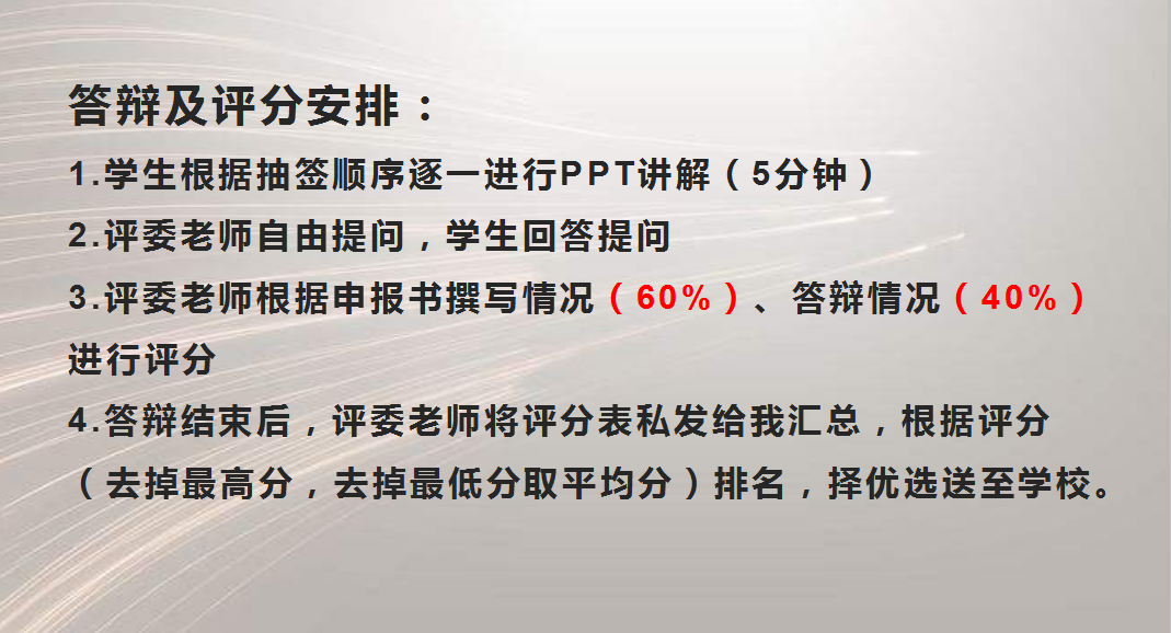 为保证学院申报项目质量,学院提前成立答辩立项评委小组,制定评分细则、确定答辩时间、审阅立项申报书。同时,由专人负责与项目答辩学生负责人做好对接工作,提前抽签、排序、提示,确保答辩过程公平、公开、公正。