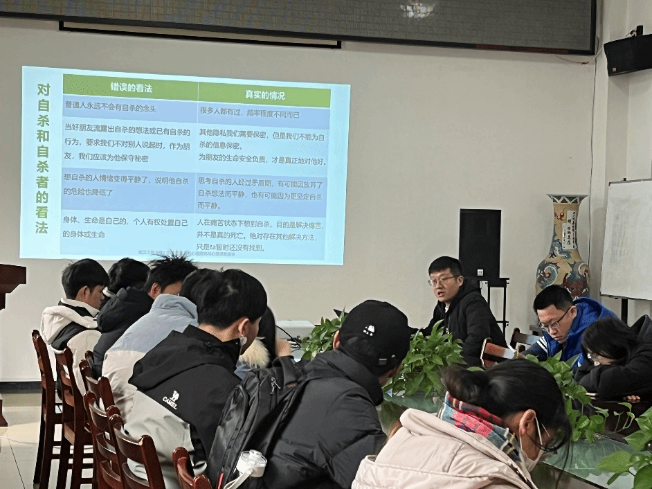 培训现场,郭星锋老师以《心理危机识别与应对》主题,围绕心理危机是什么、如何看待 “自杀”、面对心理危机我们怎样处理三方面内容,向同学们详细介绍了心理危机的相关知识。同时,他对在座的各位同学提出三点要求,一是做到掌握必要的心理危机识别与处理技能,认真履行心理委员及寝室长的相应职责,二是做到关心关爱身边同学,成为班级和寝室同学的知心朋友,三是做到实时向辅导员反馈异常言行同学信息,做好辅导员老师的可靠帮手。
