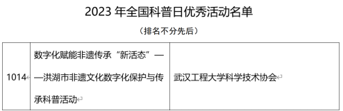 本网讯(通讯员 黄自鑫 徐丽 何怡晴)近日,由中国科协举办的“全国科普日”活动落下帷幕,我校best365网页版登录《数字化赋能非遗传承“新活态”——洪湖市非遗文化数字化保护与传承科普活动》在此次活动中获评“优秀活动”。